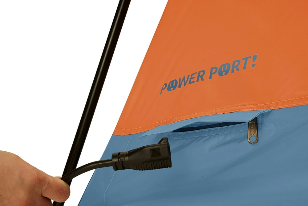 - Zippered E! Powerport lets you easily run an extension cord inside so you can keep everyone’s gadgets charged