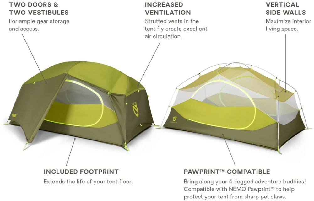 - Steep walls provide a massive interior volume, while 2 doors and 2 vestibules allow plenty of room for spreading out and storing gear
